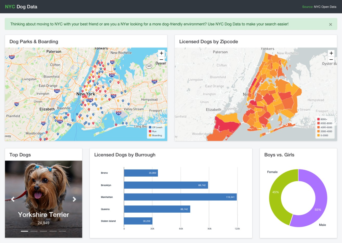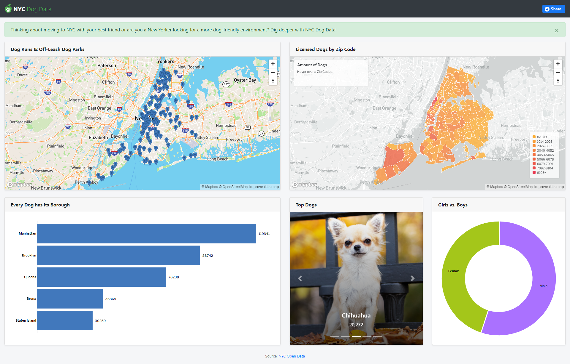 - Displays the % of total female and male dogs in NYC.